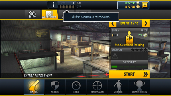 1、選擇Bsc.SustainedTraining賽事,點(diǎn)擊START進(jìn)入手槍射擊任務(wù)。
