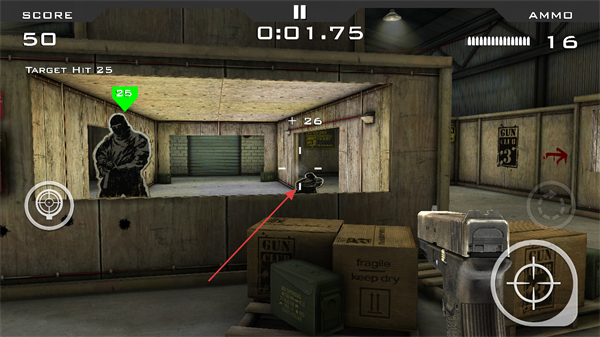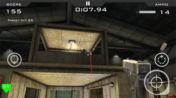 2、瞄準(zhǔn)帶有綠色25標(biāo)識(shí)的目標(biāo)射擊,積累分?jǐn)?shù),注意剩余彈藥和時(shí)間。