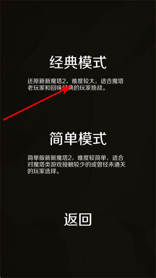 1、進(jìn)入游戲后,選擇經(jīng)典模式,這是體驗高難度挑戰(zhàn)的關(guān)鍵操作,選擇后可還原新新魔塔2的經(jīng)典玩法。