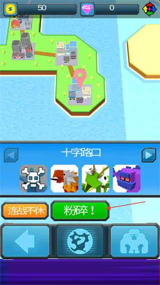 2、點(diǎn)擊城鎮(zhèn)進(jìn)行選擇關(guān)卡,不同城鎮(zhèn)的怪獸也各不相同,點(diǎn)擊下方綠色粉碎按鈕進(jìn)入關(guān)卡。