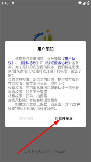 1、在用戶須知彈窗中,點(diǎn)擊同意并接受,進(jìn)入APP首頁。