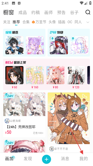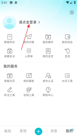 1、打開(kāi)畫加,點(diǎn)擊頁(yè)面右下角我的,可進(jìn)入個(gè)人中心頁(yè)面。