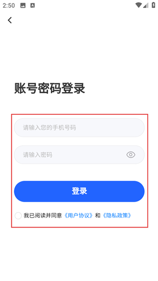 3、在賬號密碼登錄頁面,輸入信息,同意協(xié)議后點擊登錄可完成賬號登錄。