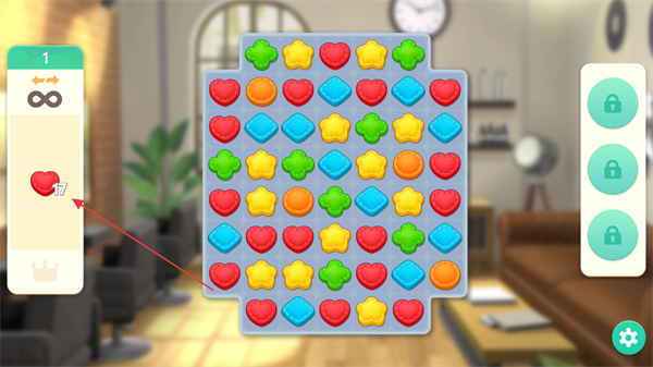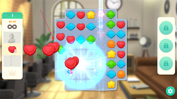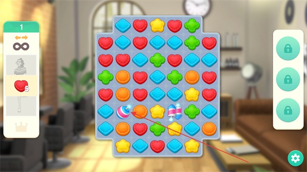 1、觀察關(guān)卡目標(biāo)如收集愛心,尋找三個(gè)及以上相同圖案的糖果,通過交換位置使其連成一線消除,完成收集任務(wù)。