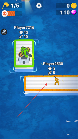 1、在木筏上與其他玩家如Player2530對戰(zhàn),利用武器攻擊,減少對方生命值。