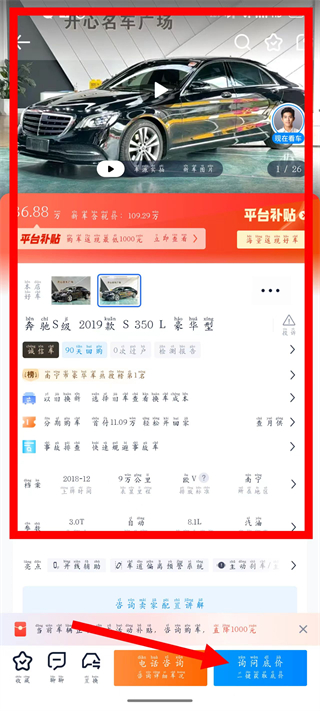 4、在車型詳情頁,點擊咨詢底價或電話咨詢按鈕,進一步了解車輛信息及購車價格。