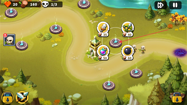 2、在藍(lán)色據(jù)點(diǎn)上可以搭建四種不同的防御塔,分別為箭塔、魔法塔、炮塔、士兵塔。