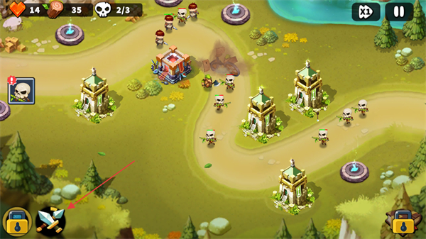 3、當(dāng)怪物過(guò)多防御塔打不過(guò)來(lái)的情況下,可以點(diǎn)擊左下角的劍圖標(biāo),向指定位置投放拿著劍的綠怪打手幫忙作戰(zhàn)。
