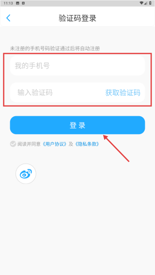 4、在驗證碼登錄頁面,輸入手機號和驗證碼后點擊登錄,完成驗證碼登錄操作。