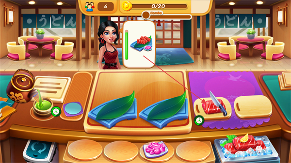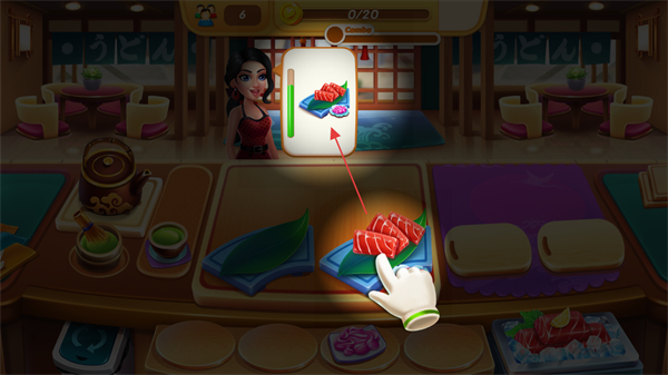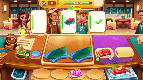 3、同時(shí)處理多位顧客的不同訂單如壽司、抹茶,高效制作料理。