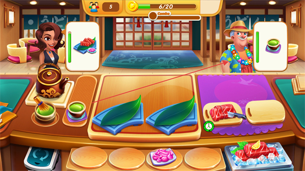 4、及時(shí)完成顧客訂單,獲取金幣獎(jiǎng)勵(lì),積累分?jǐn)?shù)推進(jìn)烹飪之旅進(jìn)程。