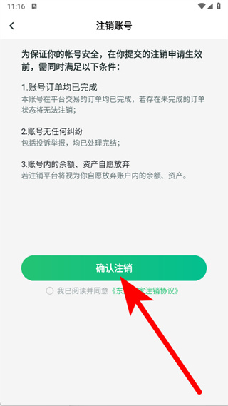 5、確認(rèn)滿(mǎn)足注銷(xiāo)條件,勾選后,點(diǎn)擊確認(rèn)注銷(xiāo),完成賬號(hào)注銷(xiāo)。