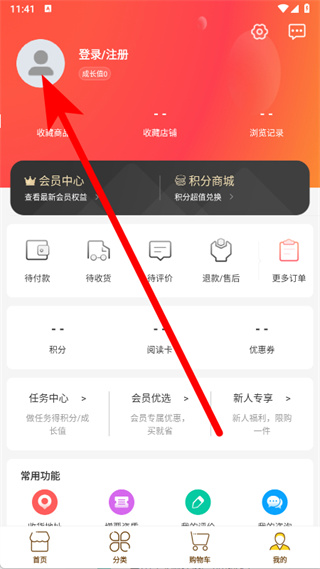 2、在個人中心頁面,點擊登錄注冊區(qū)域,跳轉至登錄界面。
