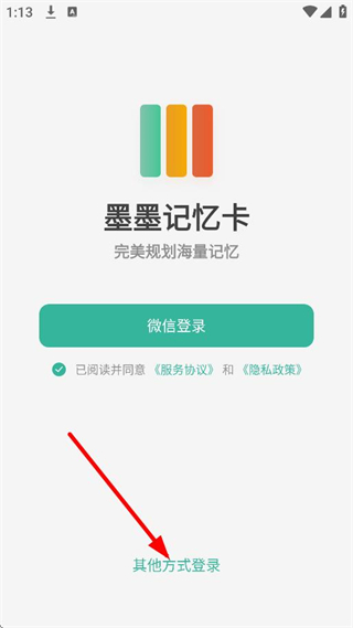 1、在墨墨記憶卡登錄頁面,點(diǎn)擊其他方式登錄,進(jìn)入其他方式登錄頁面。