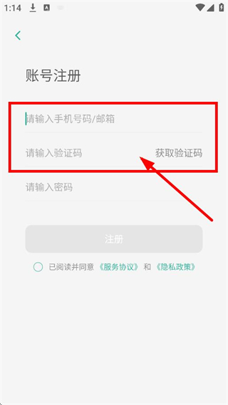 3、在賬號(hào)注冊(cè)頁面,輸入手機(jī)號(hào)碼/郵箱,點(diǎn)擊獲取驗(yàn)證碼并輸入驗(yàn)證碼。