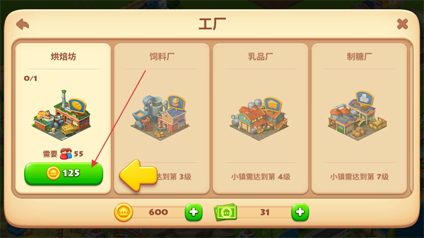 1、在工廠界面,當小鎮(zhèn)達到對應等級且擁有足夠資源時,如烘焙坊需小鎮(zhèn)等級滿足且消耗125金幣,點擊購買按鈕。