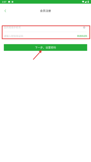 4、在會員注冊頁面,輸入手機(jī)號和驗證碼后點擊下一步,設(shè)置密碼,完成賬號注冊操作。