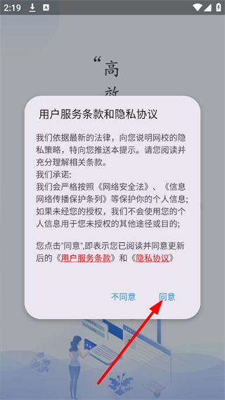 1、在用戶服務條款和隱私協(xié)議彈窗中,點擊同意,進入登錄頁面。