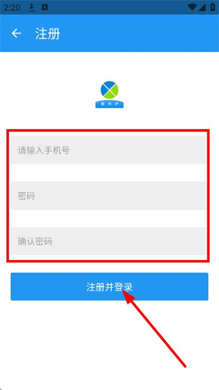 3、輸入手機號、密碼、確認密碼后點擊注冊并登錄,完成賬號注冊并登錄。