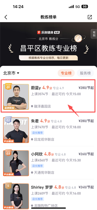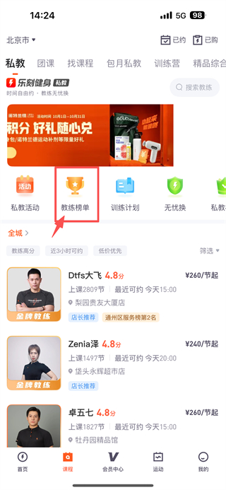 2、在課程頁(yè)面,點(diǎn)擊教練榜單選項(xiàng),瀏覽教練榜單列表。