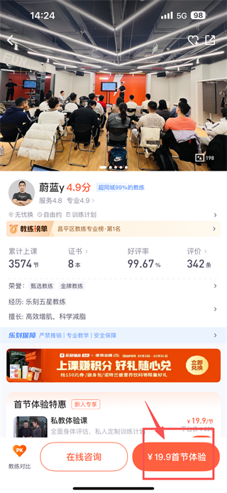 4、在教練詳情頁(yè),點(diǎn)擊¥19.9首節(jié)體驗(yàn)按鈕,完成私教體驗(yàn)課的購(gòu)買(mǎi)操作。