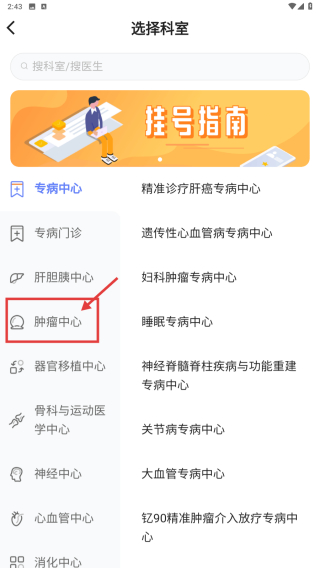 2、在選擇科室頁面,點擊腫瘤中心科室分類。
