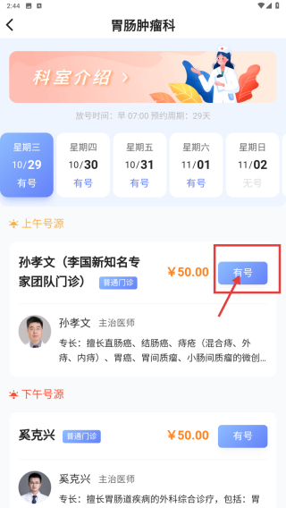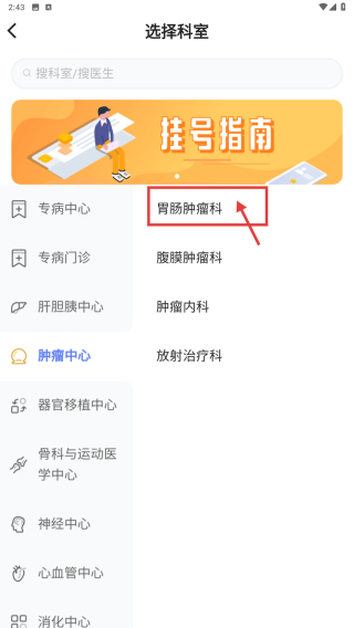 3、在胃腸腫瘤科掛號頁面,找到胃腸腫瘤科并點擊,進入胃腸腫瘤科掛號頁面。