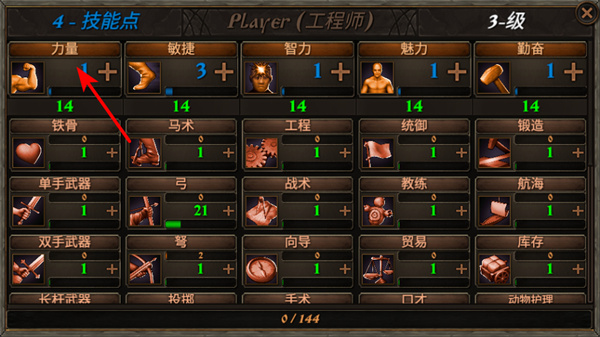2、在技能點(diǎn)分配界面,可點(diǎn)擊力量屬性旁的+號(hào),提升角色力量屬性,增強(qiáng)角色的戰(zhàn)斗或生存能力。
