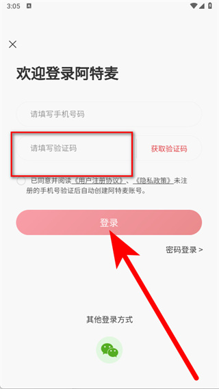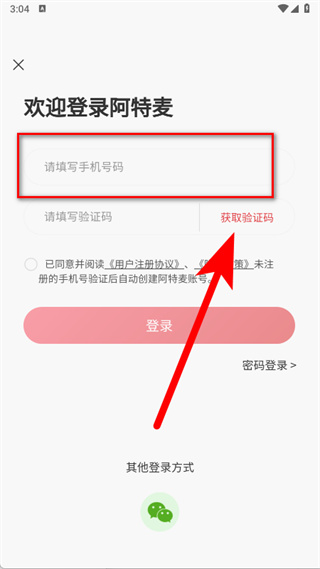 3、在登錄界面,輸入手機號碼,點擊獲取驗證碼。