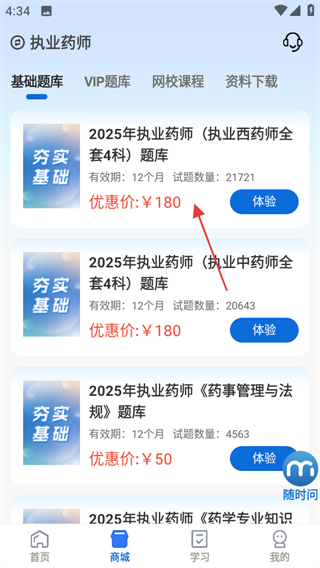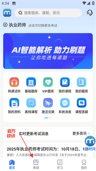 1、打開(kāi)莽過(guò)教育,在首頁(yè)點(diǎn)擊商城,可進(jìn)入題庫(kù)購(gòu)買頁(yè)面。