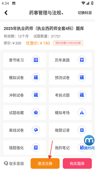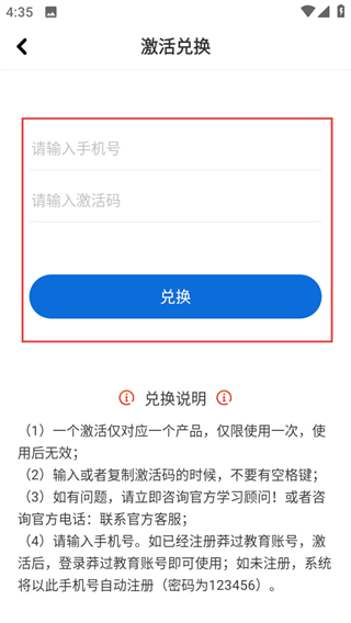4、在激活兌換頁(yè)面,輸入手機(jī)號(hào)和激活碼后點(diǎn)擊兌換可完成題庫(kù)激活。