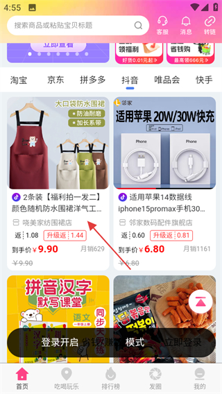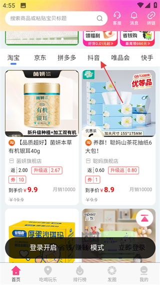 1、打開氧惠,在首頁點(diǎn)擊抖音,可進(jìn)入抖音商品推薦頁面。