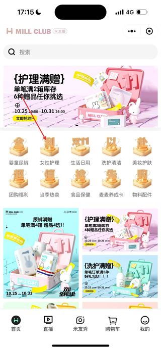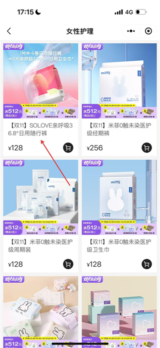 1、打開(kāi)米友圈,點(diǎn)擊女性護(hù)理,可進(jìn)入女性護(hù)理商品列表頁(yè)面。