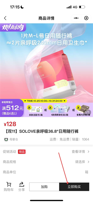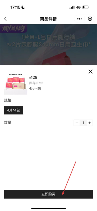 3、在商品詳情頁(yè)面,點(diǎn)擊立即購(gòu)買可進(jìn)入商品規(guī)格選擇頁(yè)面。