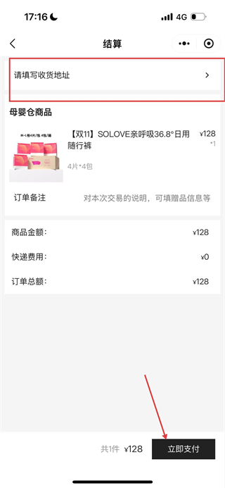 5、在結(jié)算頁(yè)面,填寫收貨地址后點(diǎn)擊立即支付可完成商品購(gòu)買。