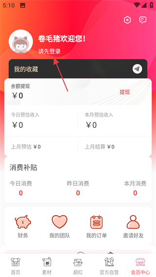 1、打開卷毛豬,點擊頁面右下角會員中心,可進入會員中心頁面。