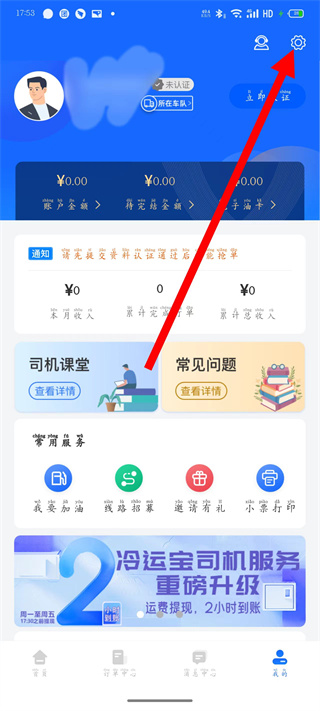1、打開(kāi)冷運(yùn)寶,點(diǎn)擊我的頁(yè)面,右上角設(shè)置圖標(biāo),進(jìn)入設(shè)置頁(yè)面。