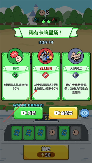 2、關卡挑戰(zhàn)前可以抽取角色屬性卡牌用于提升和人數增加調整。