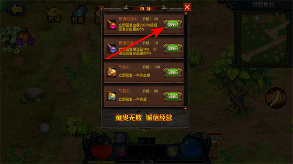 3、在市場界面,點擊購買按鈕可購買恢復(fù)類藥品,及時補(bǔ)充生命值和魔法值,保障角色在戰(zhàn)斗中的續(xù)航能力。
