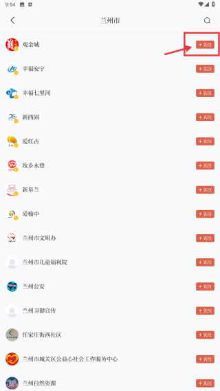 4、在賬號列表頁面,找到觀金城賬號條目,點擊其右側(cè)的+關(guān)注按鈕,完成該賬號的關(guān)注操作。