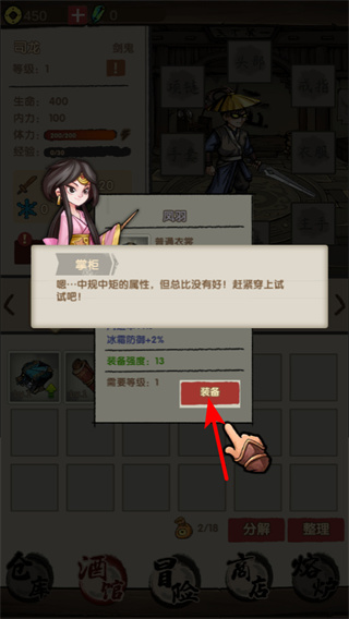 1、游戲中獲得裝備后,點(diǎn)擊裝備按鈕可穿戴裝備,提升角色屬性,這是增強(qiáng)角色戰(zhàn)力的關(guān)鍵操作,在冒險(xiǎn)中更具優(yōu)勢(shì)。