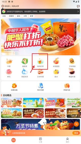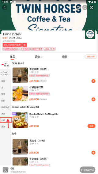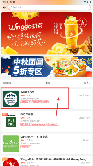 1、打開美食外賣類應用,點擊咖啡奶茶分類選項,進入咖啡奶茶商家列表頁面。