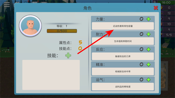 2、在角色屬性界面,點擊力量旁的加號,可提升角色近戰(zhàn)傷害和背包容量,增強角色的生存和資源收集能力。