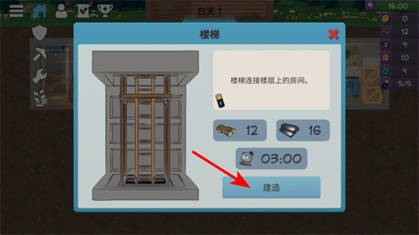 4、在建筑界面,點擊建造按鈕可建造樓梯,樓梯能連接樓層上的房間,拓展建筑結(jié)構(gòu),為后續(xù)發(fā)展提供更多空間。