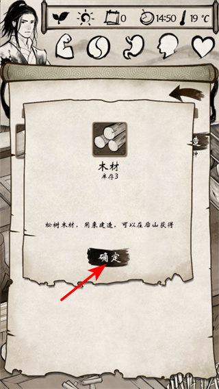 3、查看木材信息時(shí),點(diǎn)擊確定按鈕可關(guān)閉信息界面,繼續(xù)進(jìn)行建造或資源收集操作,推進(jìn)游戲進(jìn)程。