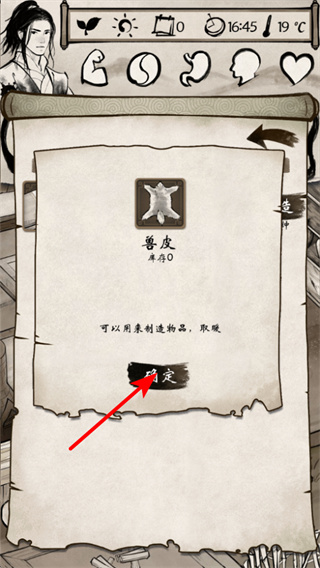 4、查看獸皮信息后,點(diǎn)擊確定按鈕關(guān)閉界面,獸皮可用于制造物品和取暖,需通過狩獵獲取,是資源。