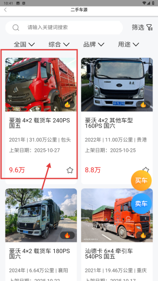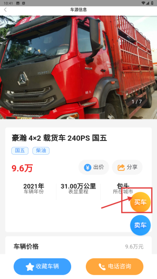 3、在二手車源列表頁(yè)面,找到豪瀚4×2載貨車240PS國(guó)五車輛條目,點(diǎn)擊進(jìn)入車輛信息頁(yè)。
