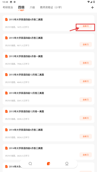 3、在四級(jí)真題列表頁(yè)面,找到2013年大學(xué)英語(yǔ)四級(jí)6月卷二真題條目,點(diǎn)擊去練習(xí)按鈕,進(jìn)入真題練習(xí)界面。