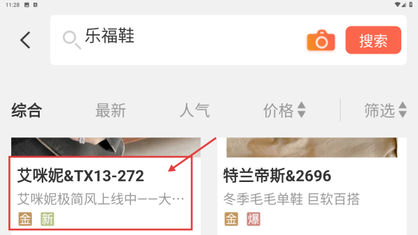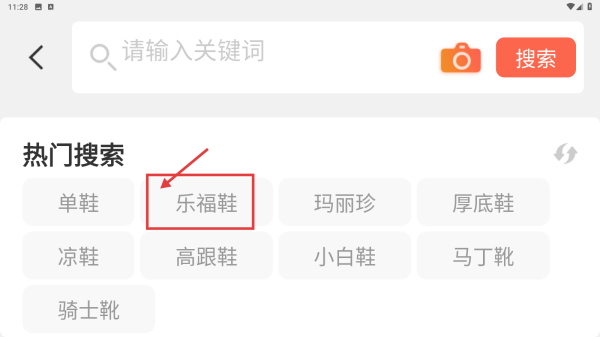 2、在搜索頁(yè)面,點(diǎn)擊熱門(mén)搜索中的樂(lè)福鞋選項(xiàng),進(jìn)入樂(lè)福鞋商品列表頁(yè)面。