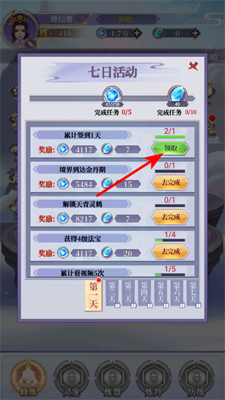 1、參與七日活動,完成任務(wù)后點擊領(lǐng)取可獲得靈氣、道具等獎勵,這是前期快速積累資源的重要途徑。